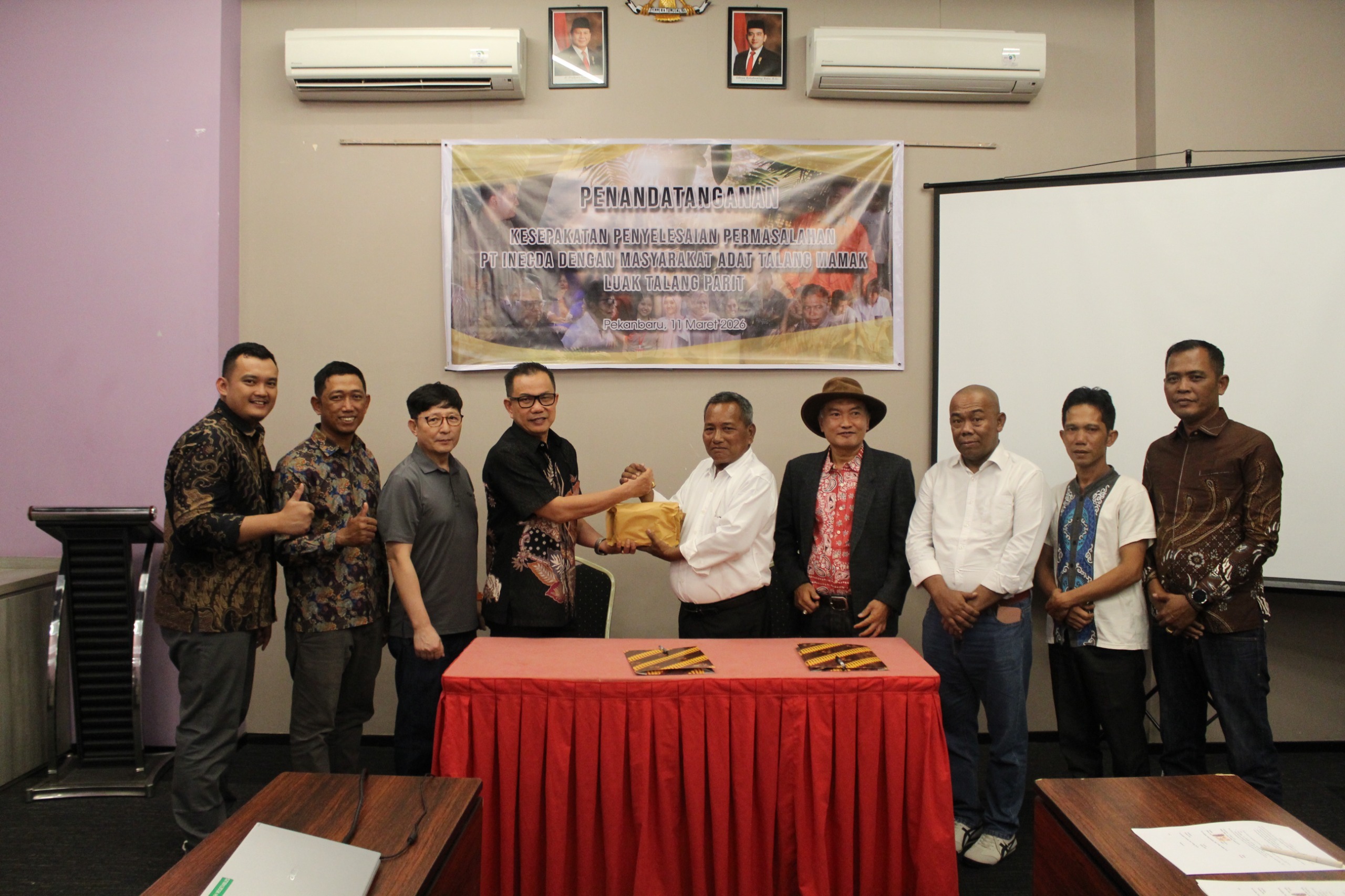 “Alhamdulillah pada hari ini, Rabu 11 Maret 2026 telah ditandatangani Dokumen Kesepakatan Penyelesaian Permasalahan antara PT Inecda dengan Masyarakat Adat Talang Mamak Luak Talang Parit dengan poin-poin kesepakatan sebagai berikut, Hibah Kebun dan Kemitraan kebun plasma untuk Masyarakat Adat sebagai peningkatan ekonomi; Program Pemberdayaan Masyarakat (PPM) yang meliputi Pilar Kesehatan, Pendidikan, Kesejahteraan Sosial Ekonomi Masyarakat dan Sosial Budaya.” Ujar Batin Irasan selaku Pimpinan Masyarakat Adat Talang Mamak Luak Talang Parit melalui rilisnya.