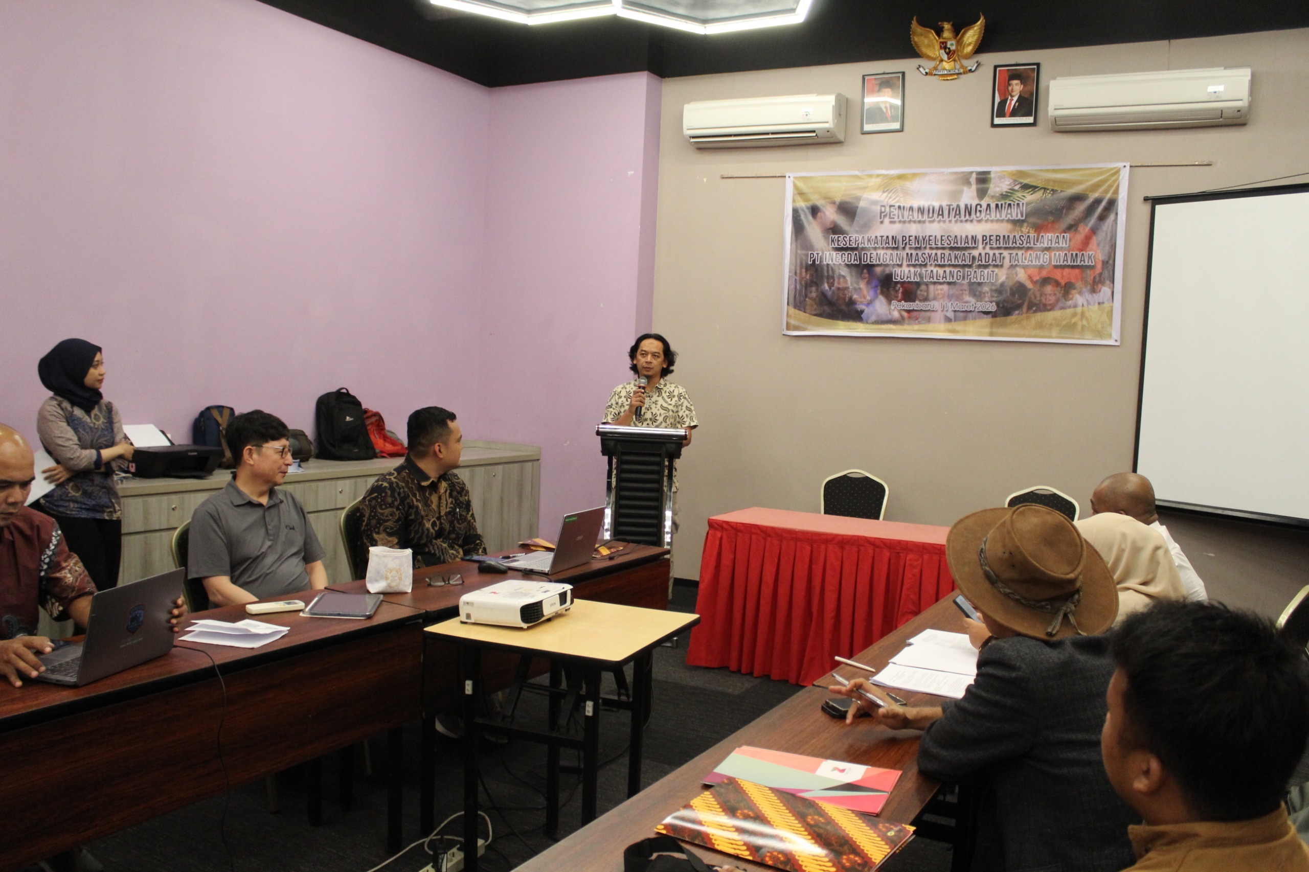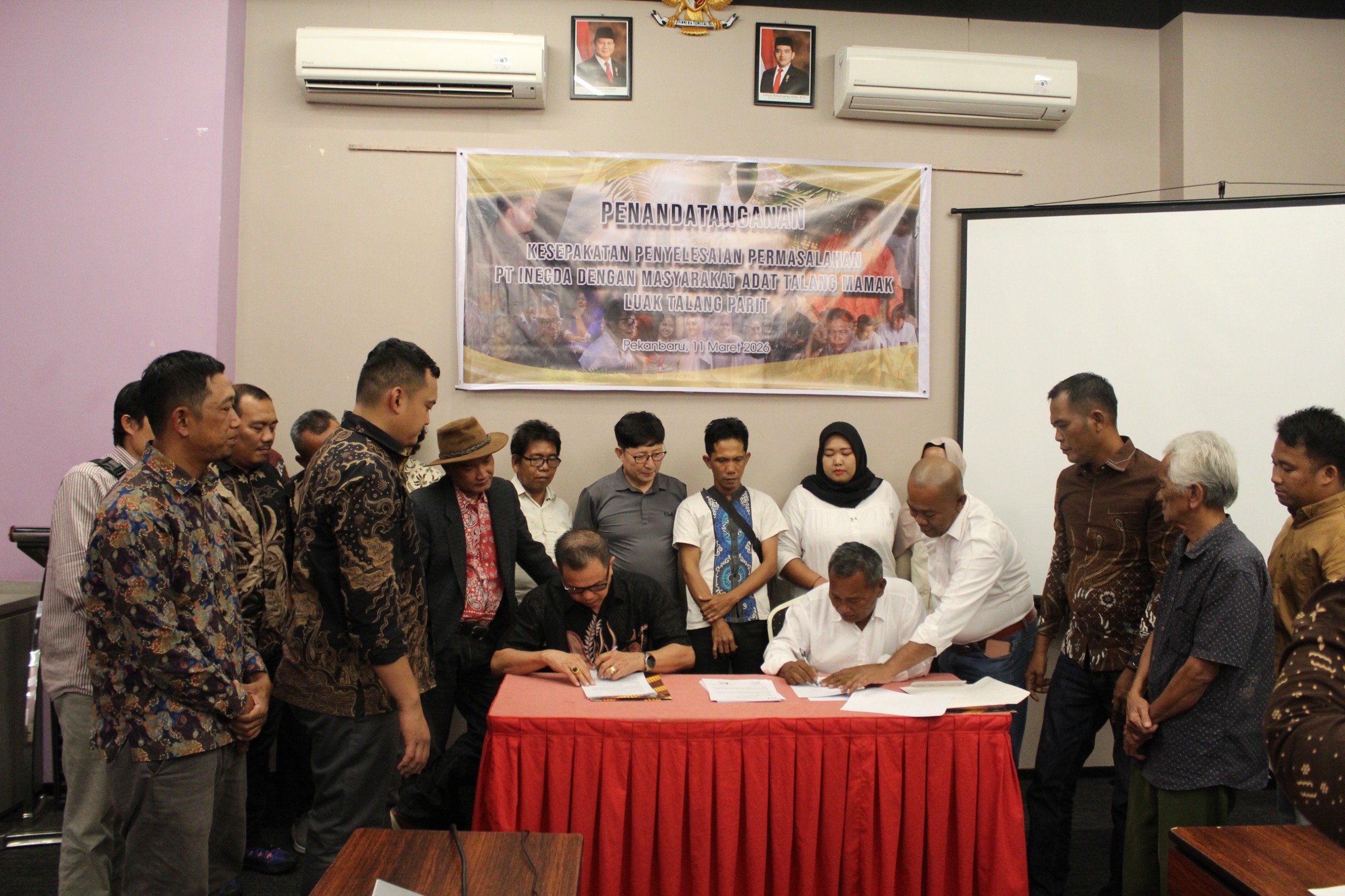 INHU– Masyarakat Adat Talang Mamak Luak Talang Parit di Desa Talang Sungai Parit, Kecamatan Rakit Kulim, Kabupaten Indragiri Hulu, Provinsi Riau akhirnya bersepakat dengan PT Inecda yang merupakan Perusahaan Perkebunan Kelapa Sawit dengan Penanaman Modal Asing (PMA) dalam penyelesaian permasalahan yang terjadi selama ini yaitu klaim tumpang tindih wilayah adat dengan Hak Guna Usaha Perusahaan.